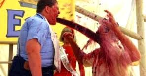 事前に油と生卵を飲み込んでから、大食いに参加。彼が出ただけで司会および観客たちからは嘲笑や罵倒。全員人格が下品。さらにこの大会が「手を使わないで食べる」という犬食いルールで、ほんとアメリカのバカっぽさを象徴したような趣向。